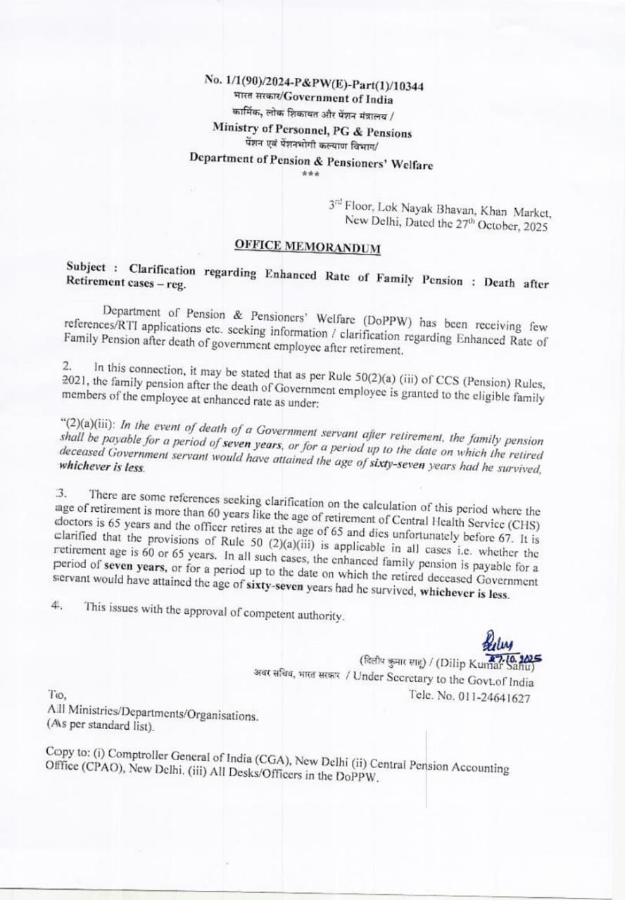 regarding Enhanced Rate of Family Pension Death after Retirement cases.